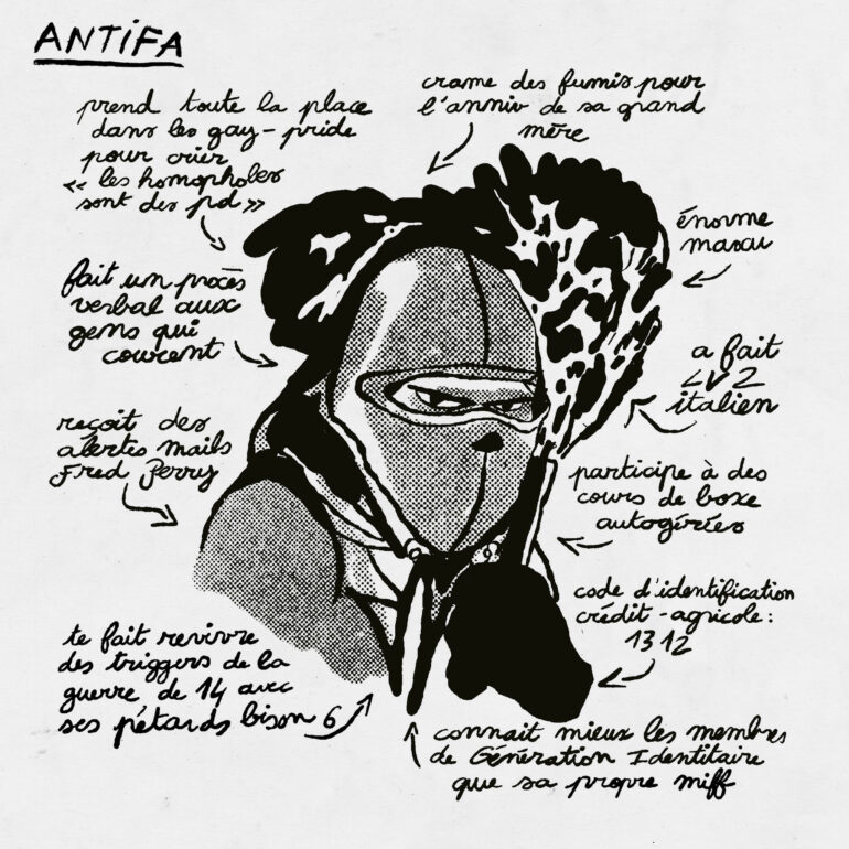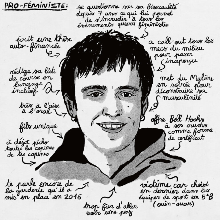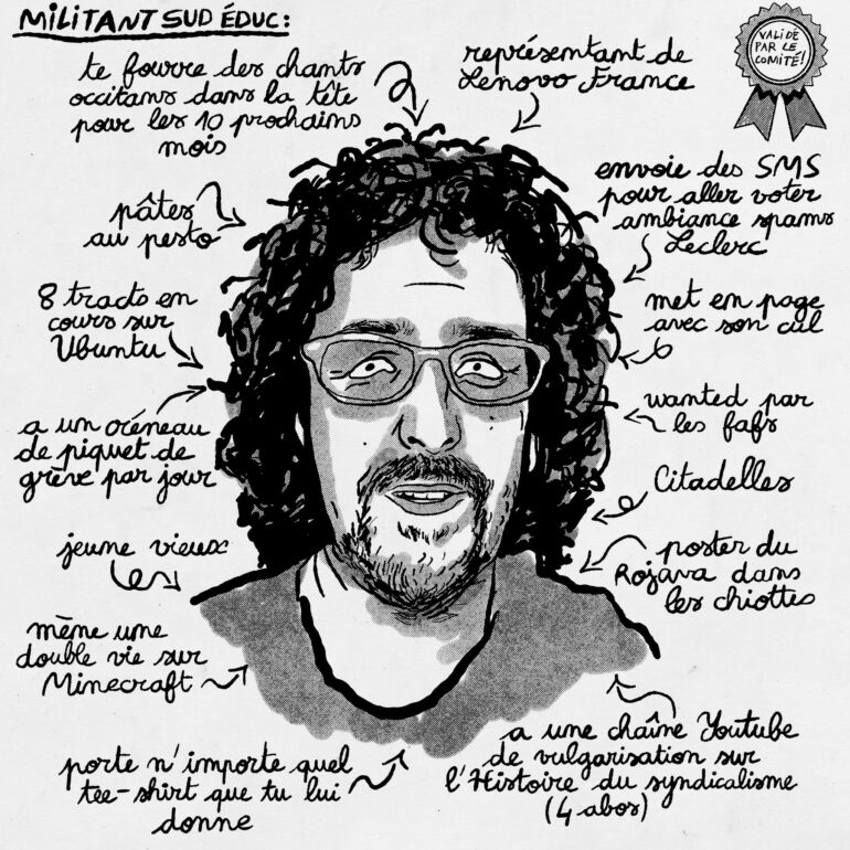 Le militant sud éduc, c’est le sang. J’ai ressenti un élan de culpabilité quand j’ai dessiné ce personnage. Il n’a pas grand chose à voir avec les autres au niveau de la manerie toxique