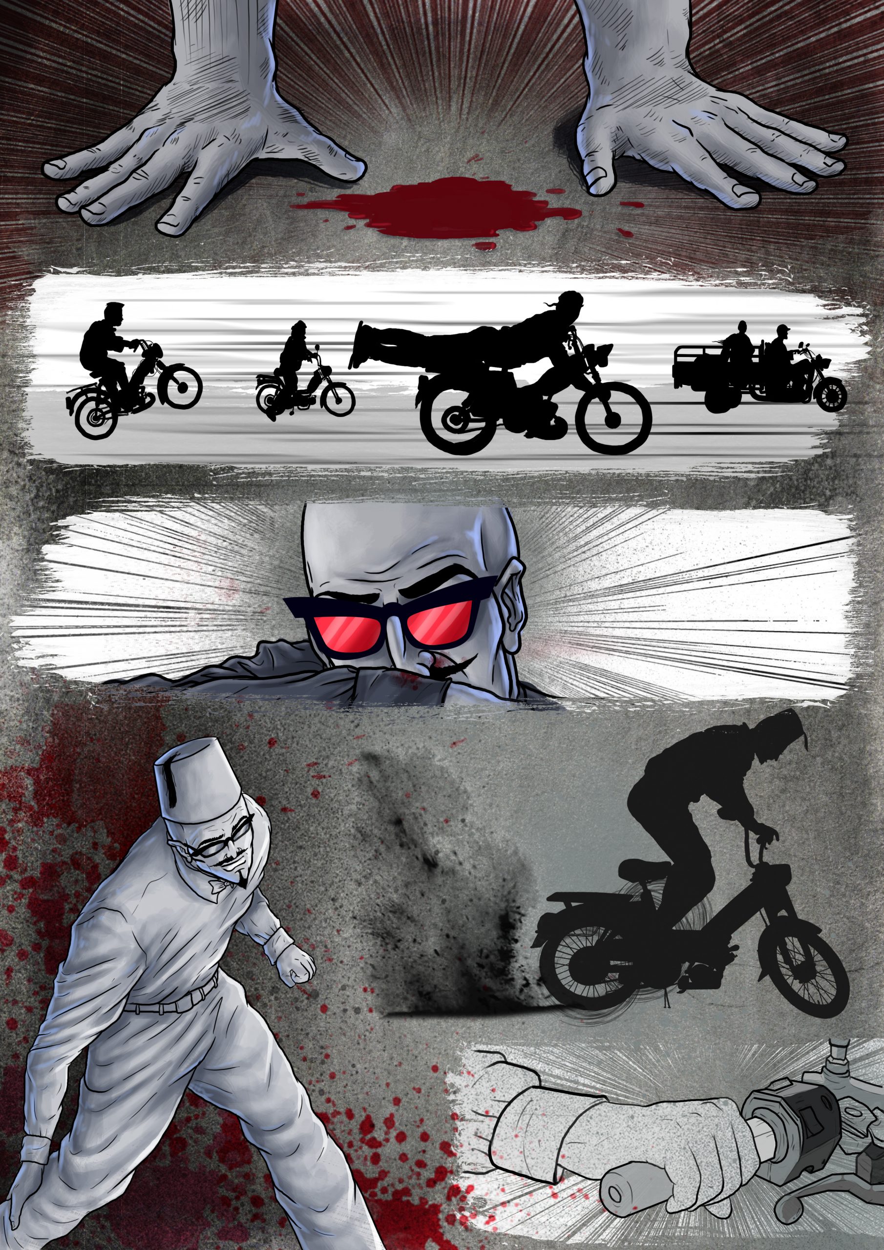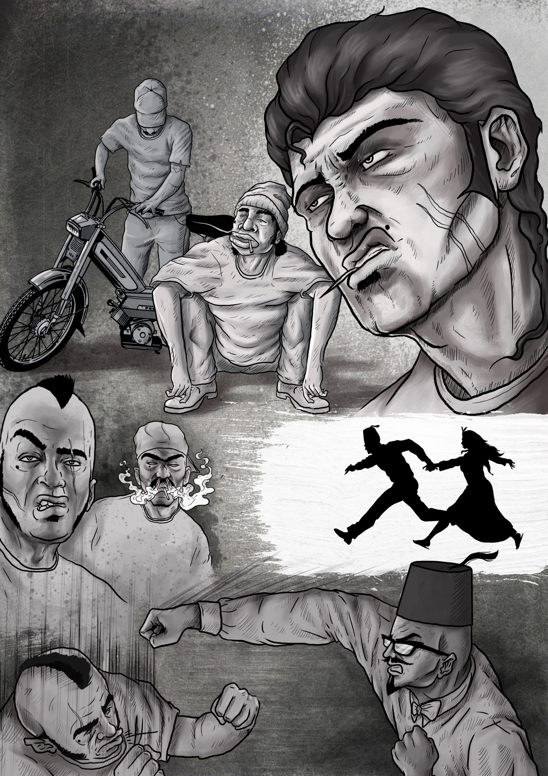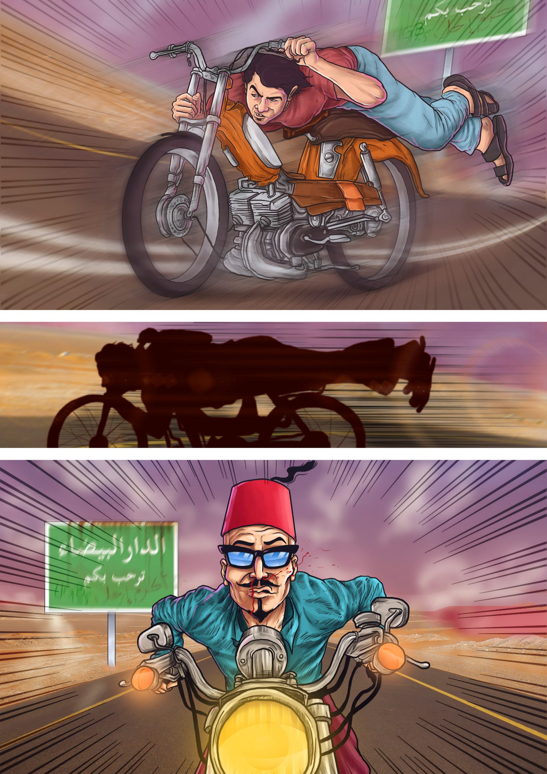 Ça, c’est trop drôle car ça me ramène à mon enfance. L’époque où je recopiais plein de dessins Marvel et DC Comics… Je créais plein de super-héros avec des super-pouvoirs marocains ! Comme « Babouche-man » qui jetait des babouches un peu partout ! J’ai toujours rêvé de créer un personnage qui représentait ma vie. C’était mon sujet de fin d’études à l’école des beaux-arts. C’est un héros sans gloire qui nous fait visiter Casablanca. Un peu comme Tintin ! Dans le premier tome, j’ai évoqué des phénomènes qui ne pouvaient se produire nulle part ailleurs. Dans le second, j’ai plutôt parlé de lui. De sa première histoire d’amour. J’ai imité le rythme des séries novelas que l’on regardait étant petits. Je me suis un peu inspiré des films indiens aussi. J’ai même imité leurs défauts en introduisant quelques facilités de narration, histoire que cela ressemble vraiment à ce genre de films. Cela avait fait un tabac au Maroc dans les années 80 et 90. Pour le tome 3, je prépare une histoire qui parlera de boxe. Ce sera une sorte de Rocky Balboa, qui mettra en valeur une pratique marocaine en voie de disparition : l’7al9a. C’est comme du théâtre de rue. Bref, tant que je suis vivant, je travaillerai sur cette série. Je la ferai vivre pour promouvoir notre culture. Peu importe si ça marche ou pas, on s’en fout. Ce qui compte, c’est l’énergie.